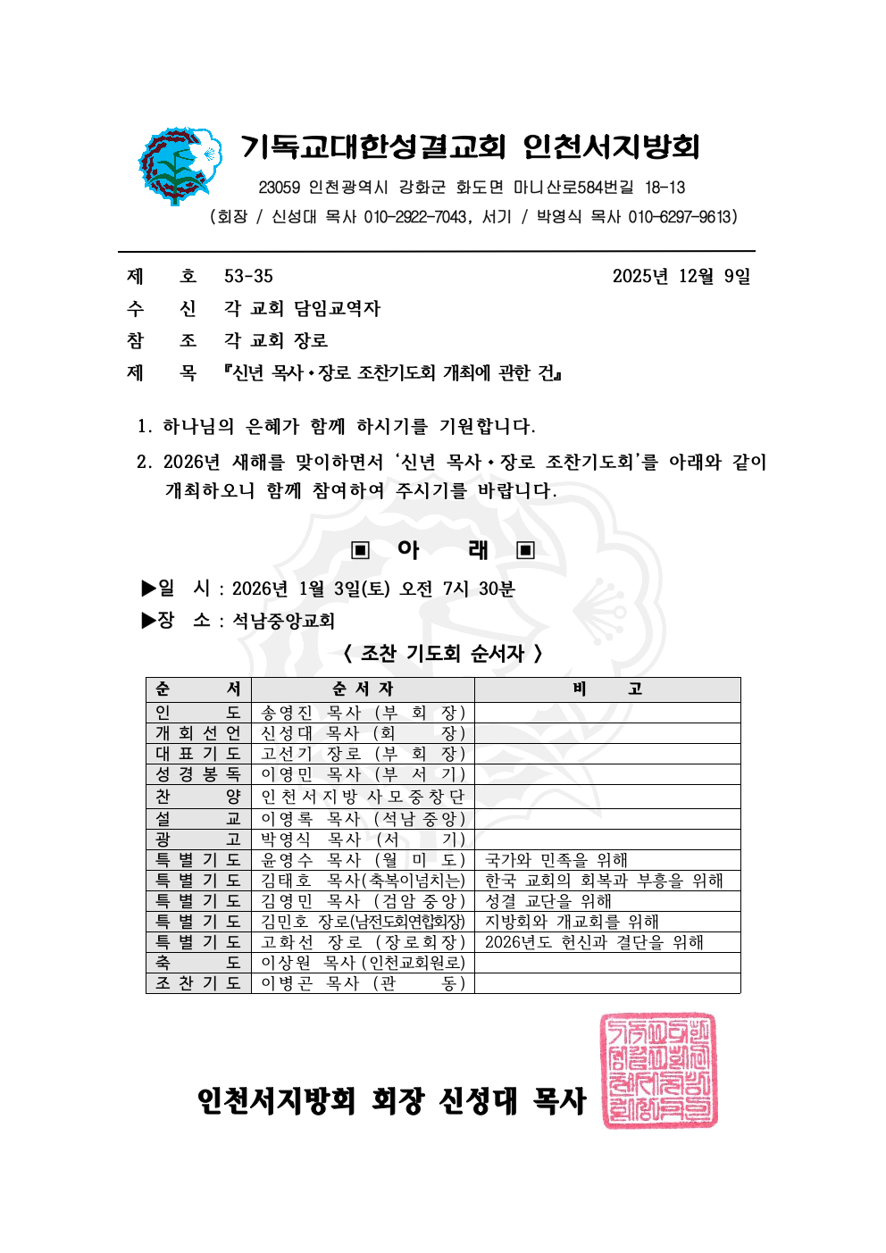 『신년 목사, 장로 조찬기도회 개최에 관한 건』공문
